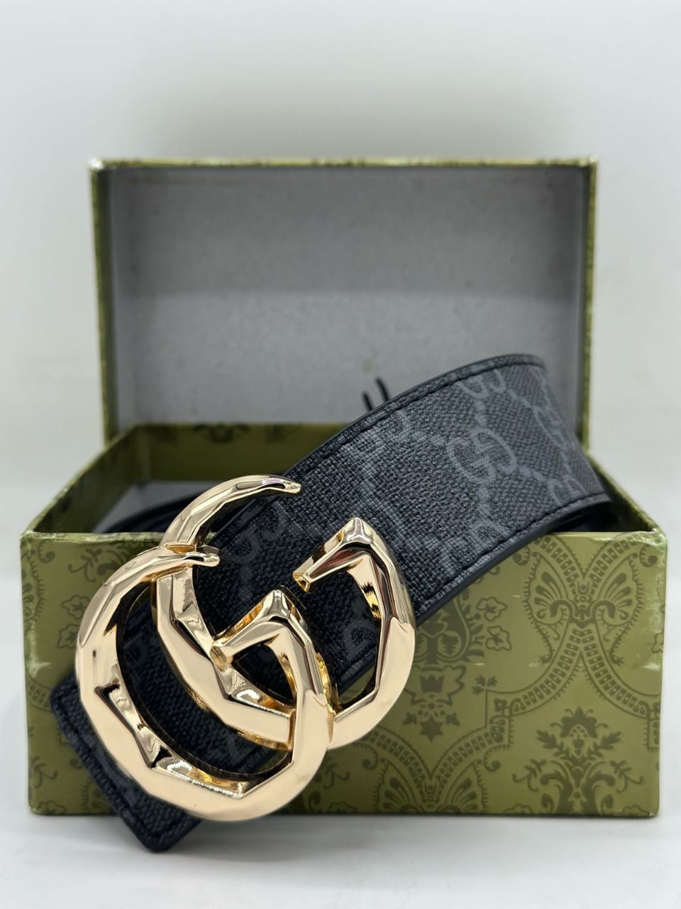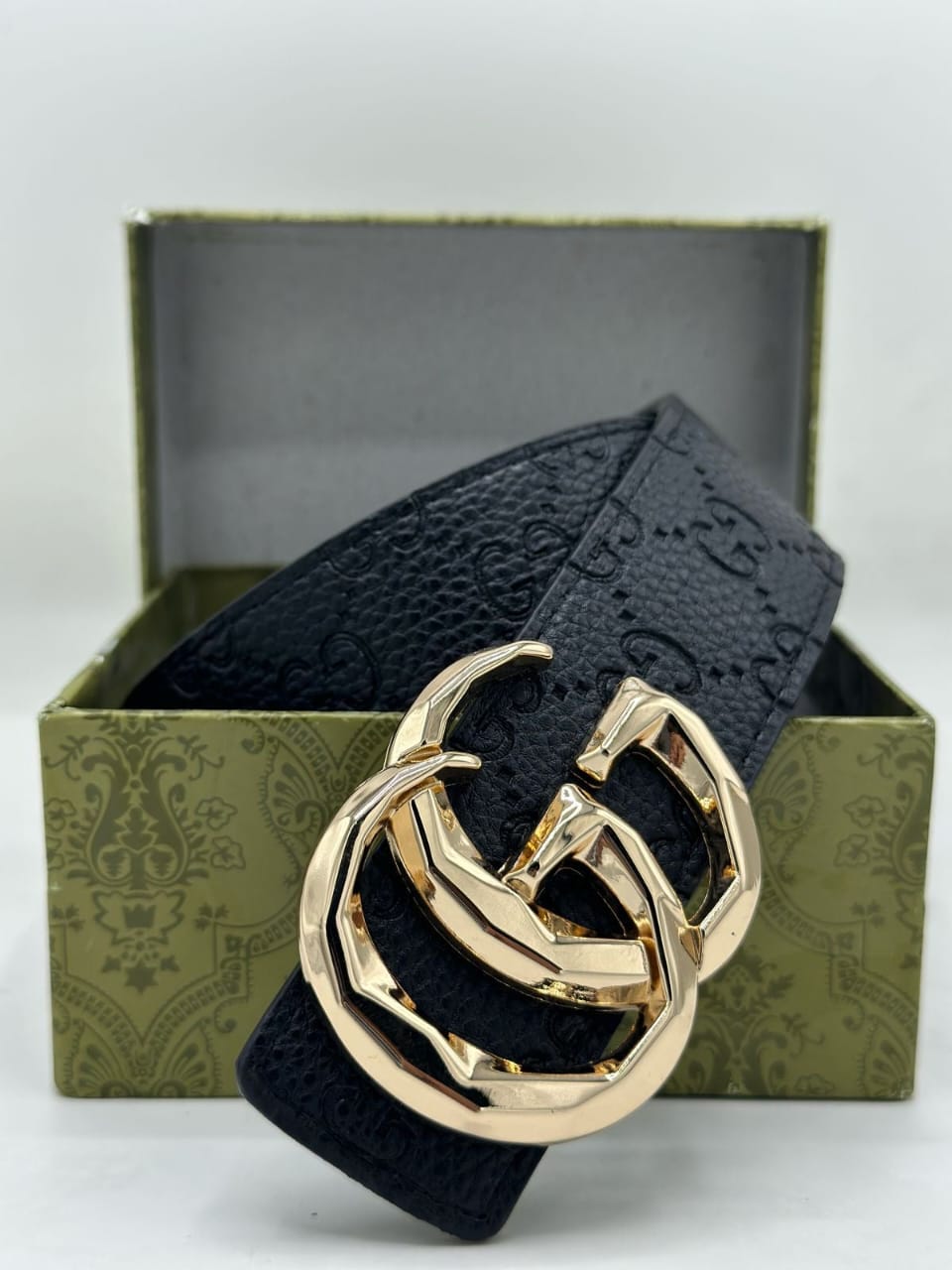 Upgrade your look with this sleek black monogram belt, finished with a bold gold GG-style buckle for a refined, high-fashion aesthetic. The textured strap features an elegant patterned design that adds depth and character, making it a standout accessory for both casual and dress outfits.