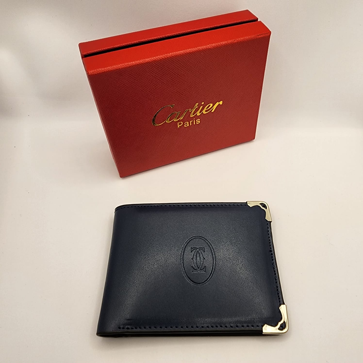 Luxury Navy Blue Leather Wallet – Elegant Bifold with Metal Corner Accents