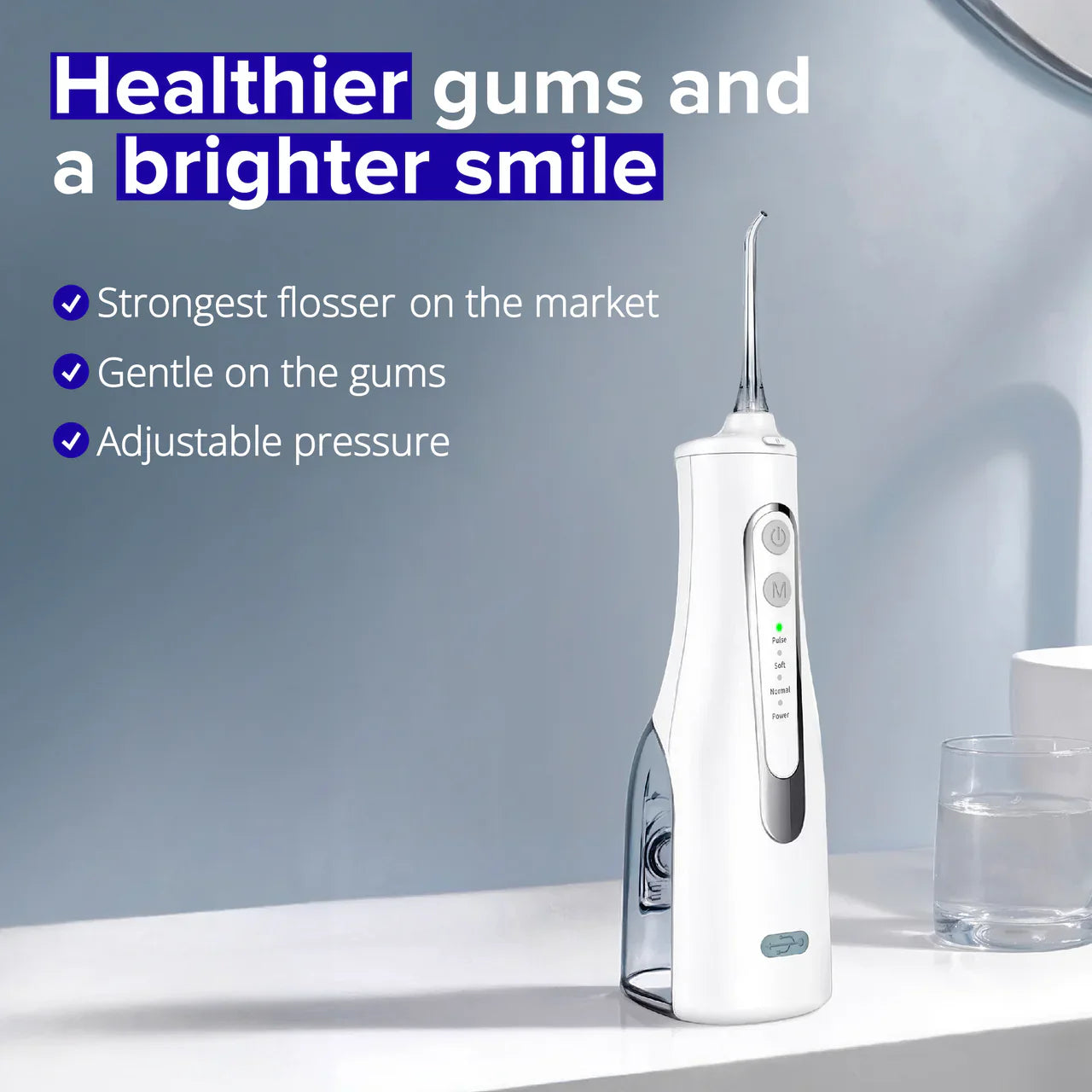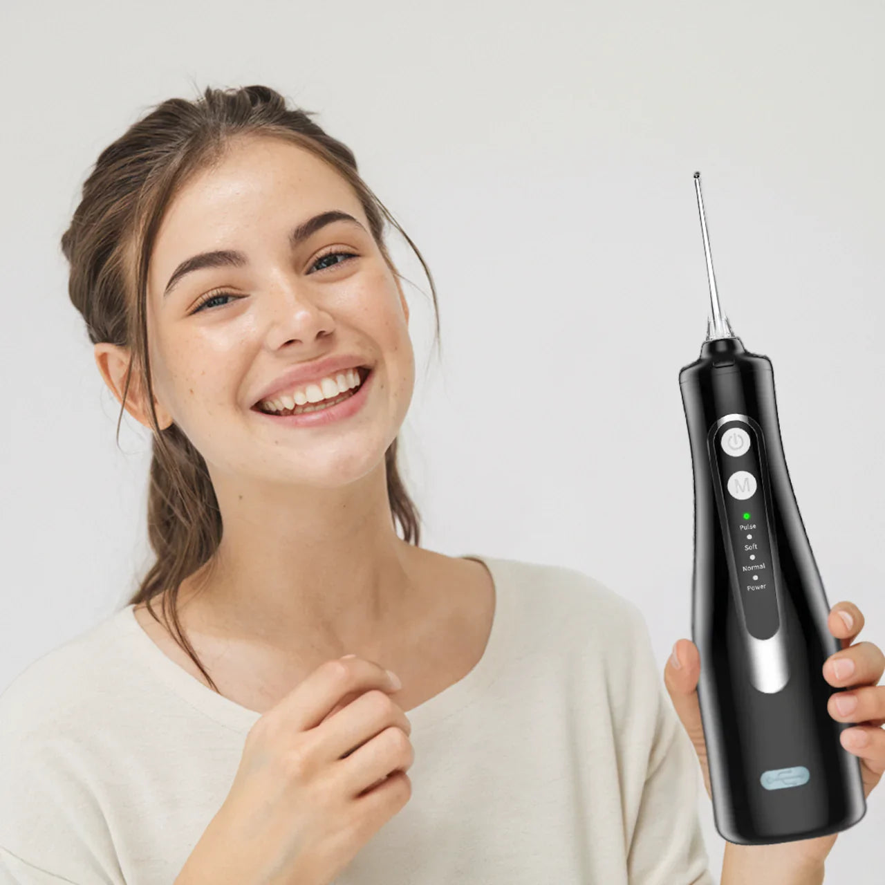 Key Features-3 modes provide a wide range ofintensity options (30-100 PSl),5 replaceable nozzles(including a tongue scraper nozzle),60-second flossing time, lPX6 waterproof foruse, universal USB cable, silent design.